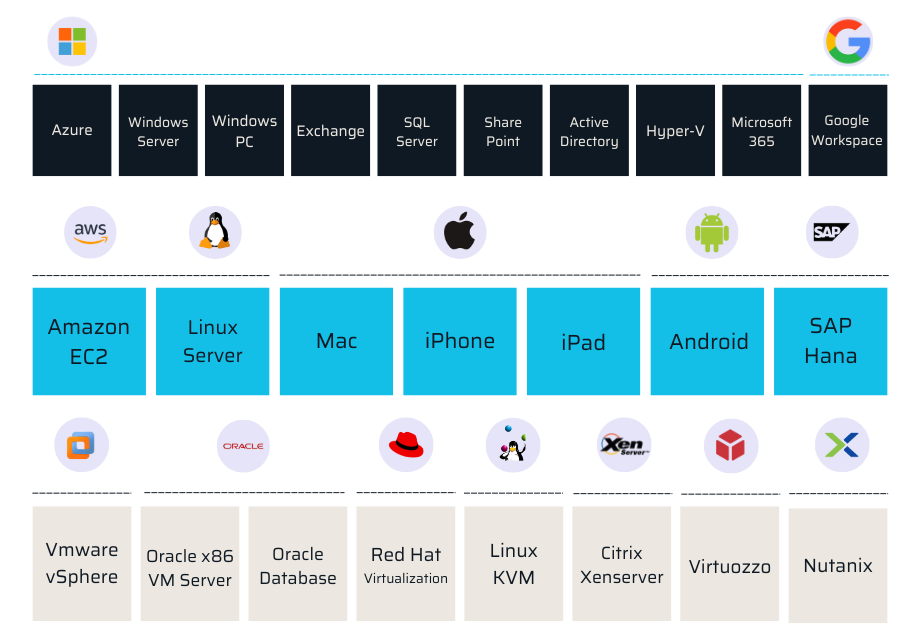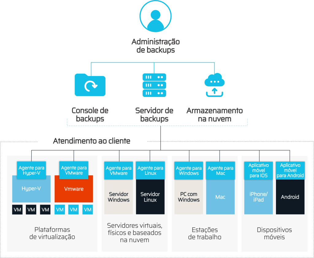 Aumente a produtividade e mantenha os erros do usuário sob controle trabalhando com apenas uma solução para todas as necessidades do cliente em vez de alternar entre ferramentas conforme o caso de uso. O Acronis Cyber Backup Cloud protege mais de 20 cargas de trabalho: